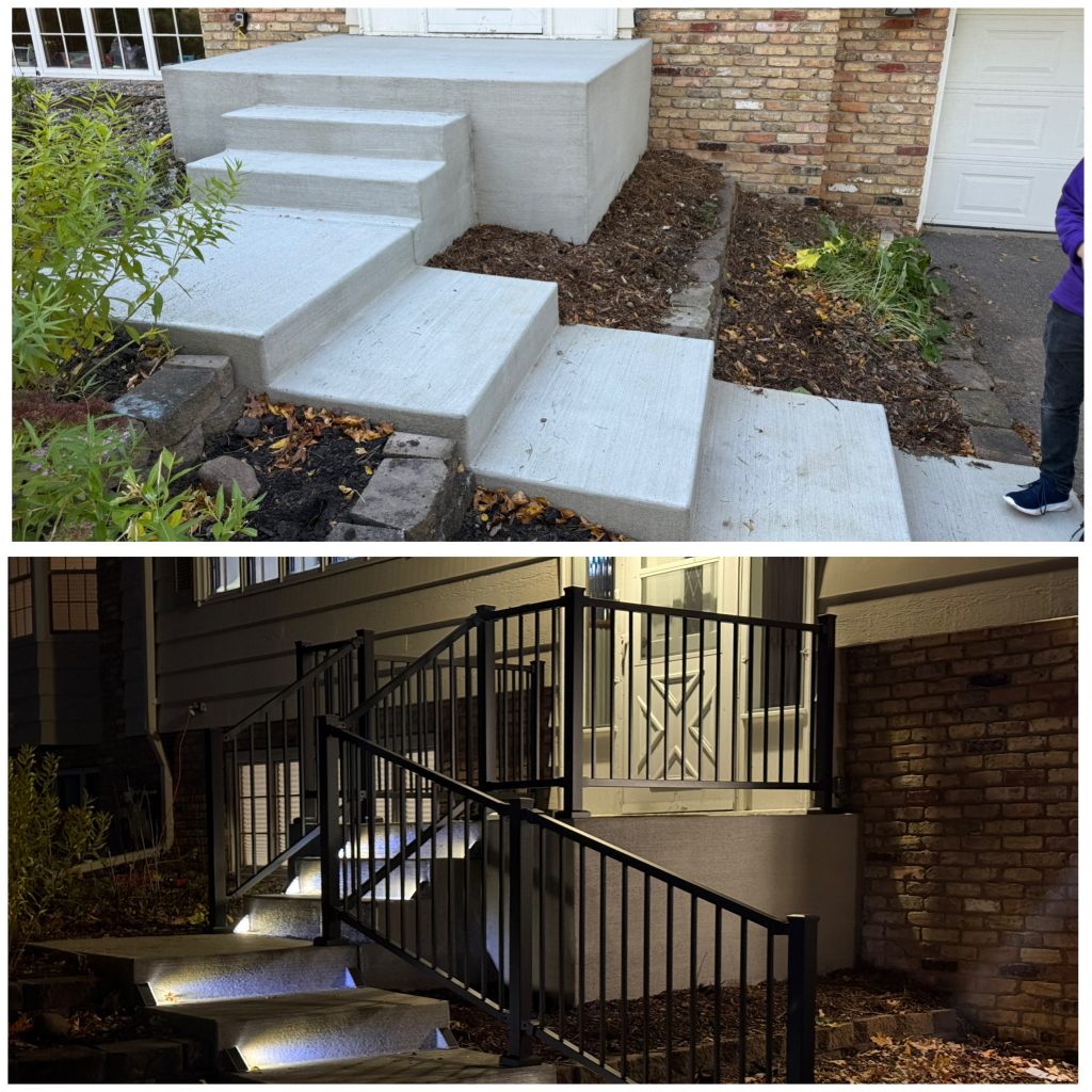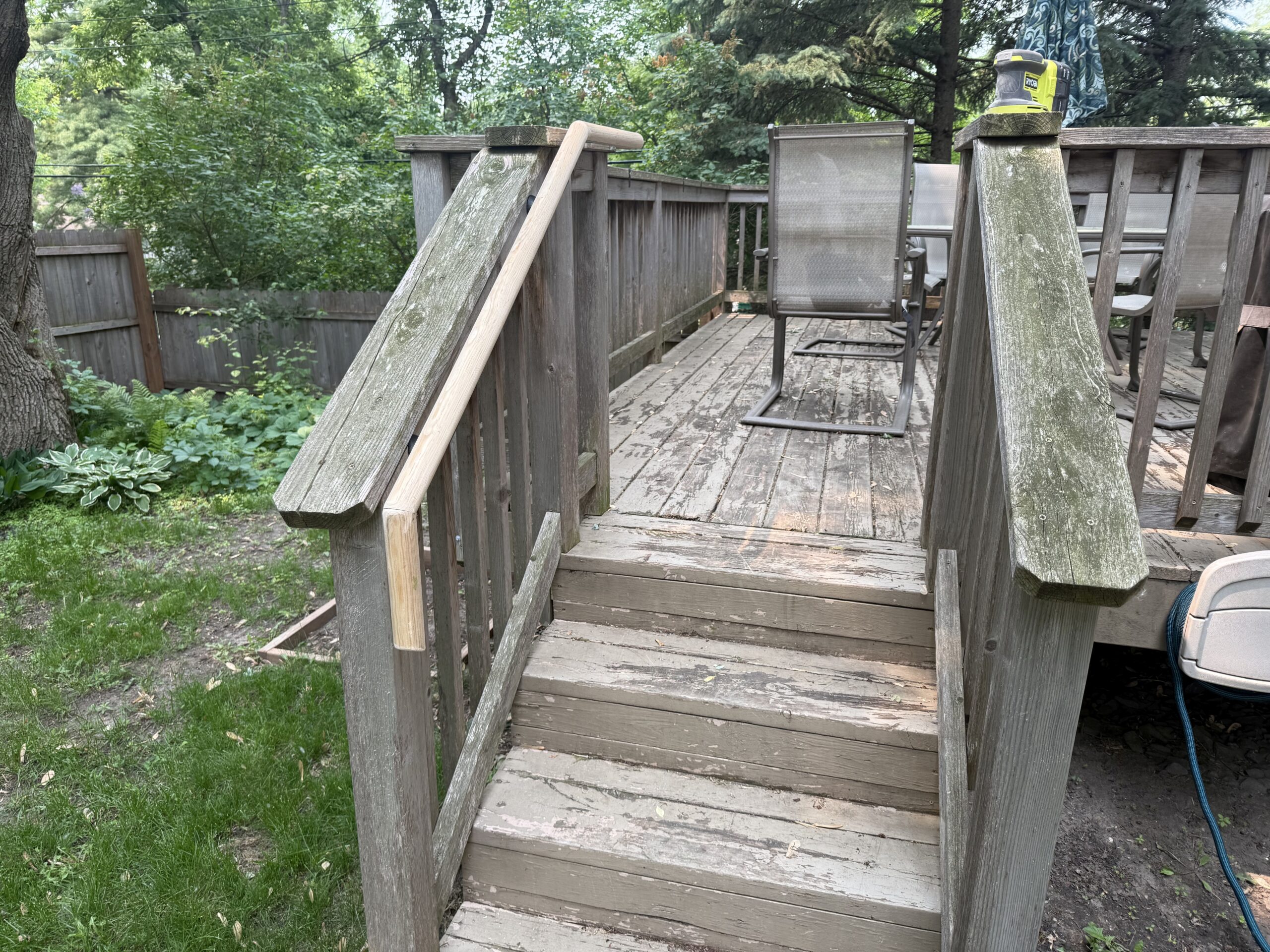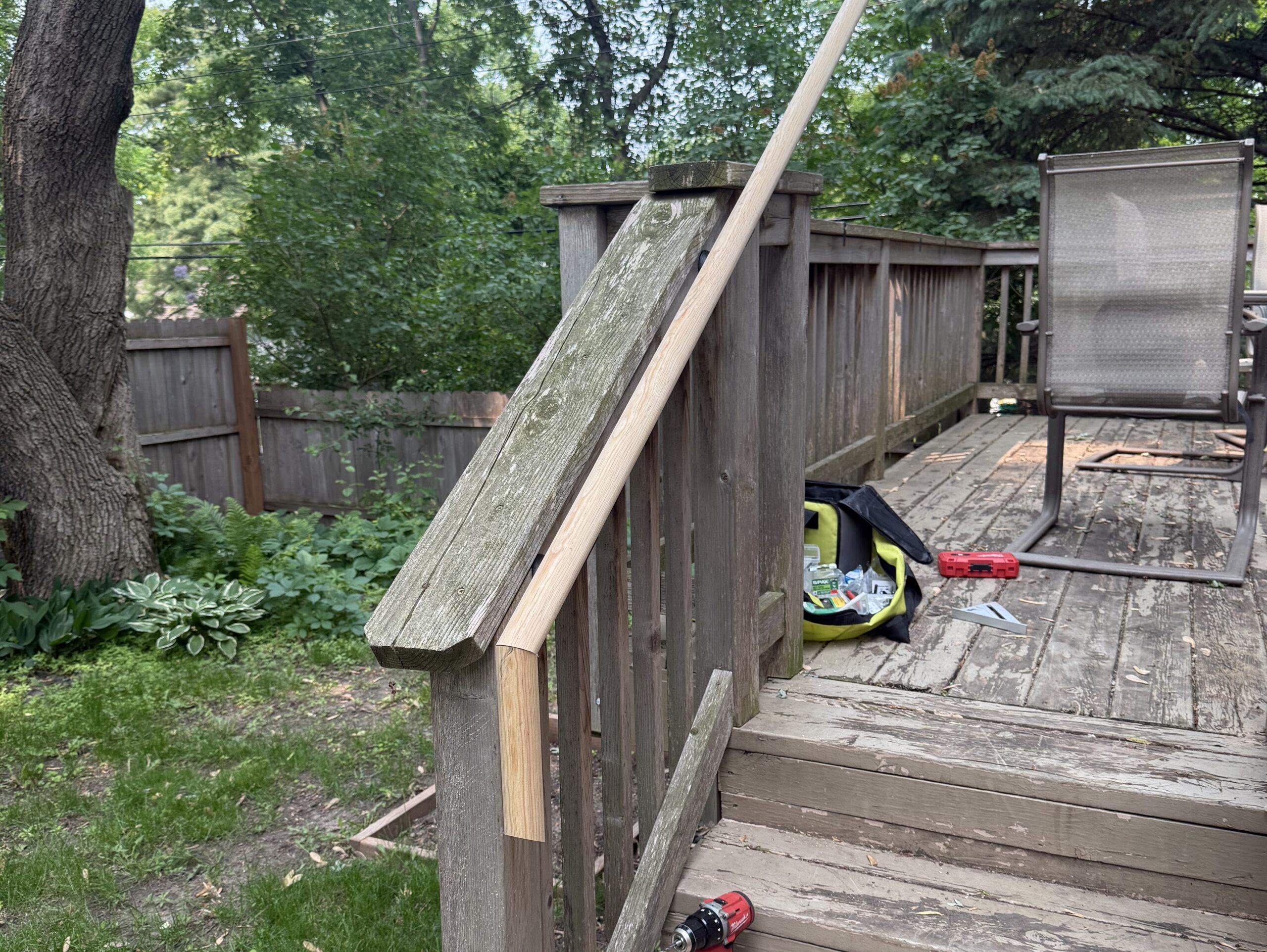 Handrails, Railing Systems for your steps and decks. Aluminum Railing Installation — Free Delivery + Free Estimate Don’t overpay for welded railings. Aluminum railing systems are durable, powder-coated, and look great on any deck or porch. – Free delivery from Menards – Free on-site estimate + sketch – We can prepare your Menards online cart so you can get the 11% rebate Pricing: • Posts: $60 installation + $84 material • Panels: $120 installation + $153–$182 material + $30–$40 brackets – Example Project (pictured above) – 10 posts, 3 straight panels, 4 stair panels – Price Calculation – [ Labor ] 10 posts × $60 = $600 8 panels × $120 = $960 Labor total = $1,560 [ Materials ]Posts: 10 × $84 = $840Straight panels: 3 × $153 = $459Stair panels: 4 × $182 = $728Straight bracket packs: 4 × $36 = $144Stair bracket packs: 4 × $46 = $184Anchors: $60Materials total = $2,415Total project cost: $3,975(Custom welded quotes were over $7,000)Plus you’ll get back about 11% from the material cost with Menards rebates. Submit a request Recent Projects Railing system installation Porch renovation Window Trim Replacement Gates Installation Steps Trim Replacement Post Station Fascia Painting Flagstone Path Deck Boards Replacement Protect the Under-Deck Area from Rain Before Before In the proccess After After Hang a chandelier Handrails Installation Bookcase fabricating Portable Washing Machine Express Connection Furniture Repair Chair base came off Wood base has broken Fabricating metal enforcement Assembling Final result Leg's joint cracked Disassembling New Joint House Trim Repair and Replacement Chimney Flashing Repair Water leakage was caused by improperly installed flashing Fixed by properly installing new flashing Final result with replaced trim board Flashing length wasn't enough Final result Crown Molding Replacement Crown deteriorated and detached New crown installed all around New crown installed all around Animal house roof improvement Old roof in bad condition Plywood is rotten New insulated roof fabrication Final result Trim End Restoration Submit a request