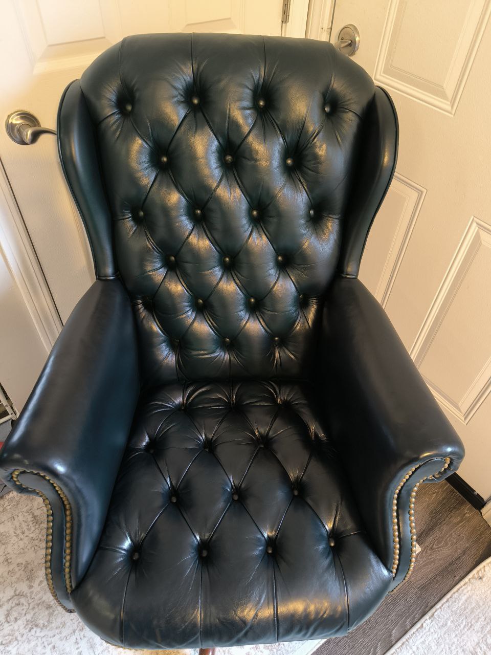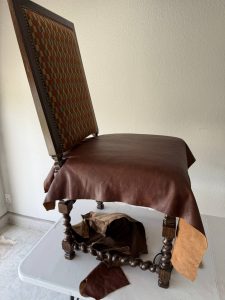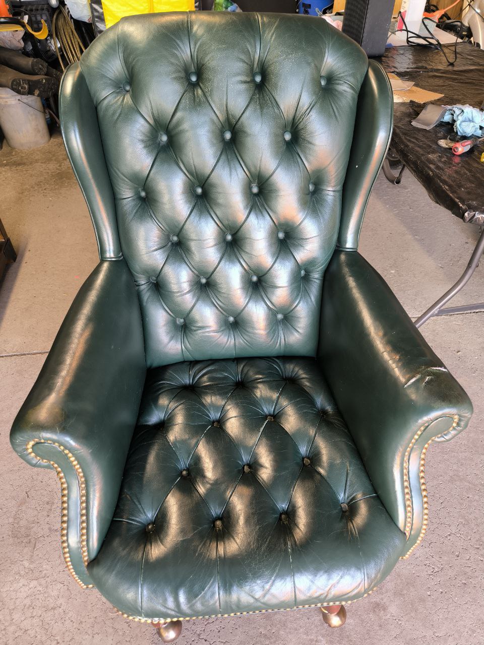 This classic emerald green leather armchair, a centerpiece of the room, had suffered significant damage to its right armrest. Years of use combined with extensive pet clawing had shredded the leather’s surface, leaving the armrest with deep gouges, loss of color, and a rough, “fuzzy” texture. The challenge was to stabilize the peeling leather fibers and reconstruct the smooth, rounded contour of the armrest while ensuring the hand-rubbed vintage patina was perfectly preserved.