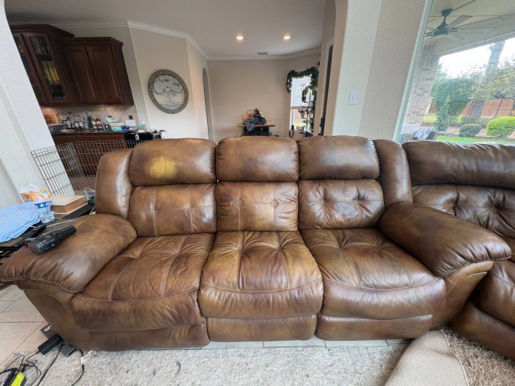 The restoration was a success, achieved through a meticulous multi-stage recoloring process. The most difficult aspect was manually recreating the two-tone pattern to match the surrounding upholstery. By layering different pigment densities, we successfully mimicked the natural “highs and lows” of the leather’s color. The sofa now looks refreshed and vibrant, with the specialized pattern seamlessly blended across the entire surface.