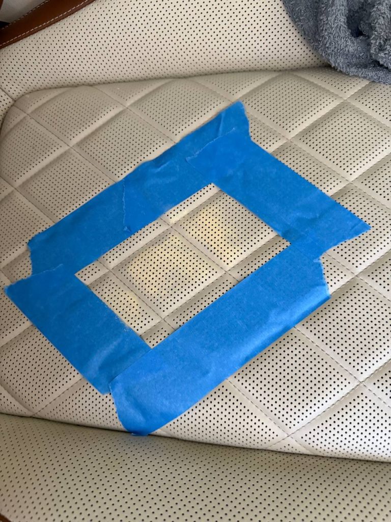 The first step is removing the top layer of the leather, which is the protective finish. This layer prevents proper paint adhesion, so it must be carefully removed using light sanding. Masking tape is applied to limit the sanding area and protect the surrounding surface.