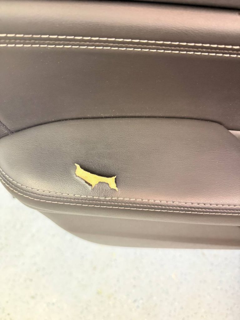 • Texture Recreation: Before the compound fully set, we manually recreated the grain texture. This ensures the repaired spot reflects light the same way as the original leatherette, making the patch invisible.