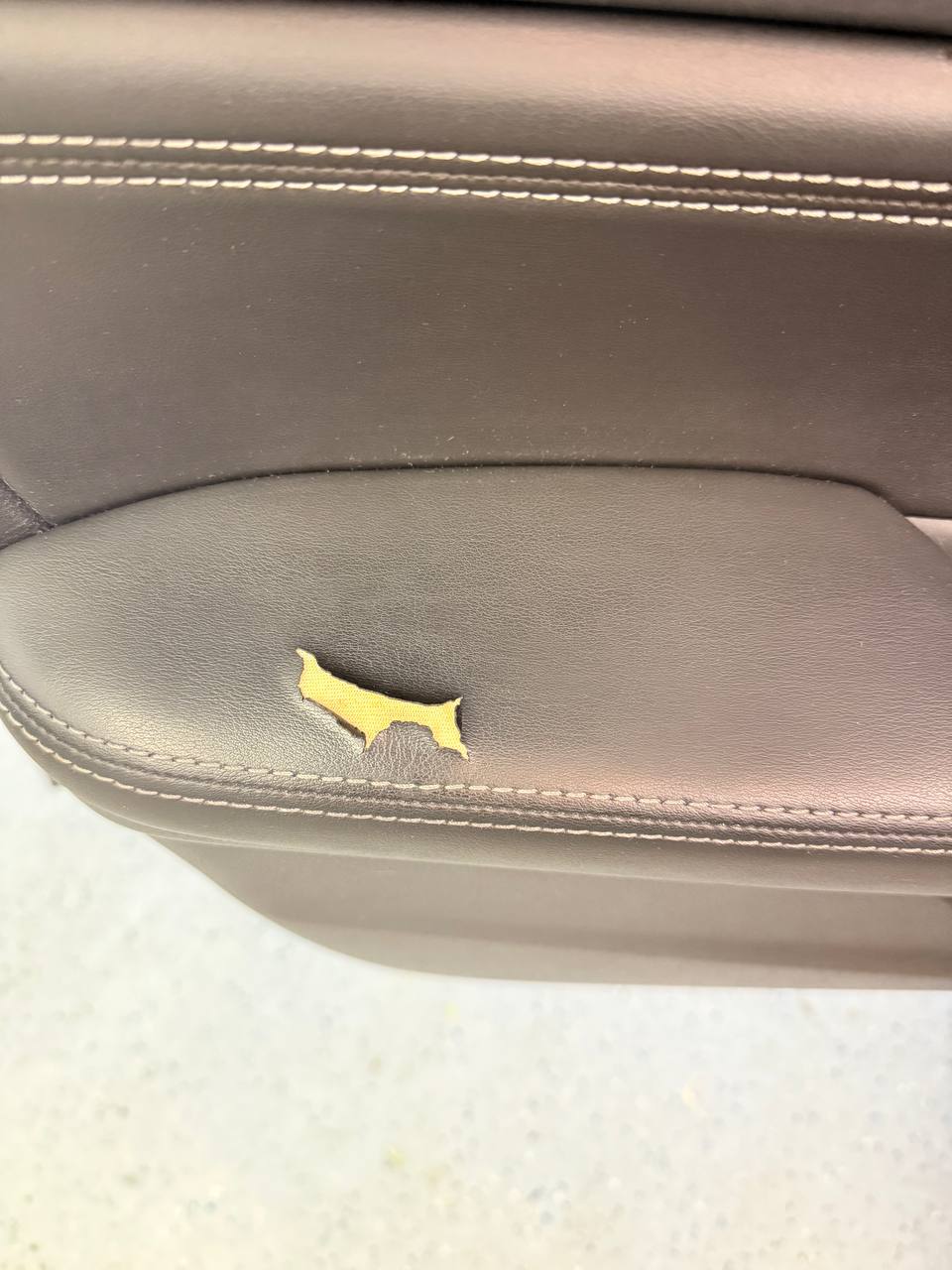 The vinyl upholstery on the interior door armrest assembly suffered a sharp puncture and material loss. Because this area is a high-touch point used every time the door is closed, the tear was not only a significant eyesore but also prone to further peeling and catching on clothing. The damage exposed the underlying yellow substrate, requiring a structural restoration rather than just a simple cleaning.
